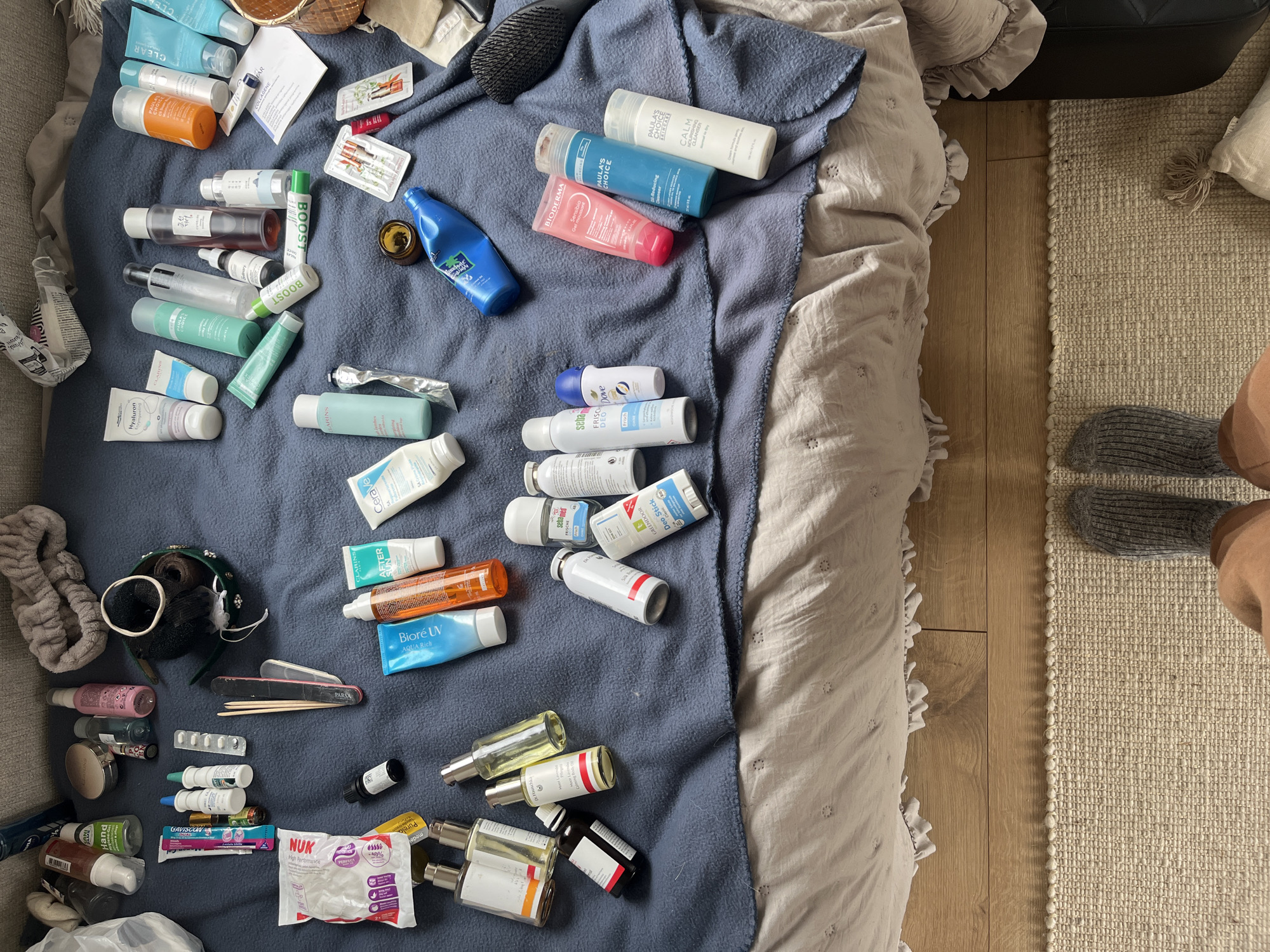 An overhead view captures a collection of personal care products, cosmetics, and toiletries meticulously laid out on a dark blue fleece blanket, which rests atop a light beige textured duvet cover with ruffled edges, likely situated on a bed or sofa in an indoor setting within the city of Gangloff, Germany. The extensive array of objects, predominantly bottles and tubes, includes various skin care items (e.g., Paula's Choice, CeraVe, Clarins, Bioderma, Dr. Hauschka, Hyaluron), sun protection (Biore UV), deodorants (Sebamed, Dove), hand sanitizers, perfumes, hair products, and small medical items such as nasal sprays and blister packs of pills. Makeup items, including a compact, a pink spray bottle, tweezers, and nail files, are also present. Hair accessories consist of a gray fabric headband, a dark green headband adorned with a bow, and a black hairbrush. A small brown woven basket and several small fabric pouches are visible among the items. The lower portion of the frame reveals a light brown wooden floor with visible seams, partially covered by a light-colored, tightly woven rug. The lower legs and feet of one individual are visible, clad in ribbed gray socks and light brown trousers, standing on the rug. The items are arranged in an organized, spread-out manner, suggesting a process of unpacking, sorting, or preparation.