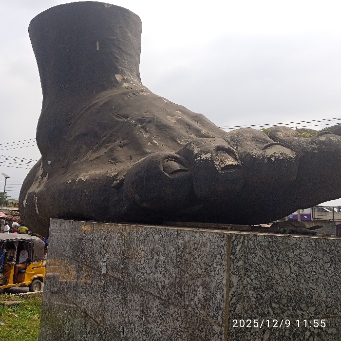 - "The scene depicts a monumental, dark-grey statue of a human right foot, approximately 10-15 feet in length, resting horizontally on a polished granite plinth" by FM-OYL682, licensed under CC BY 4.0
