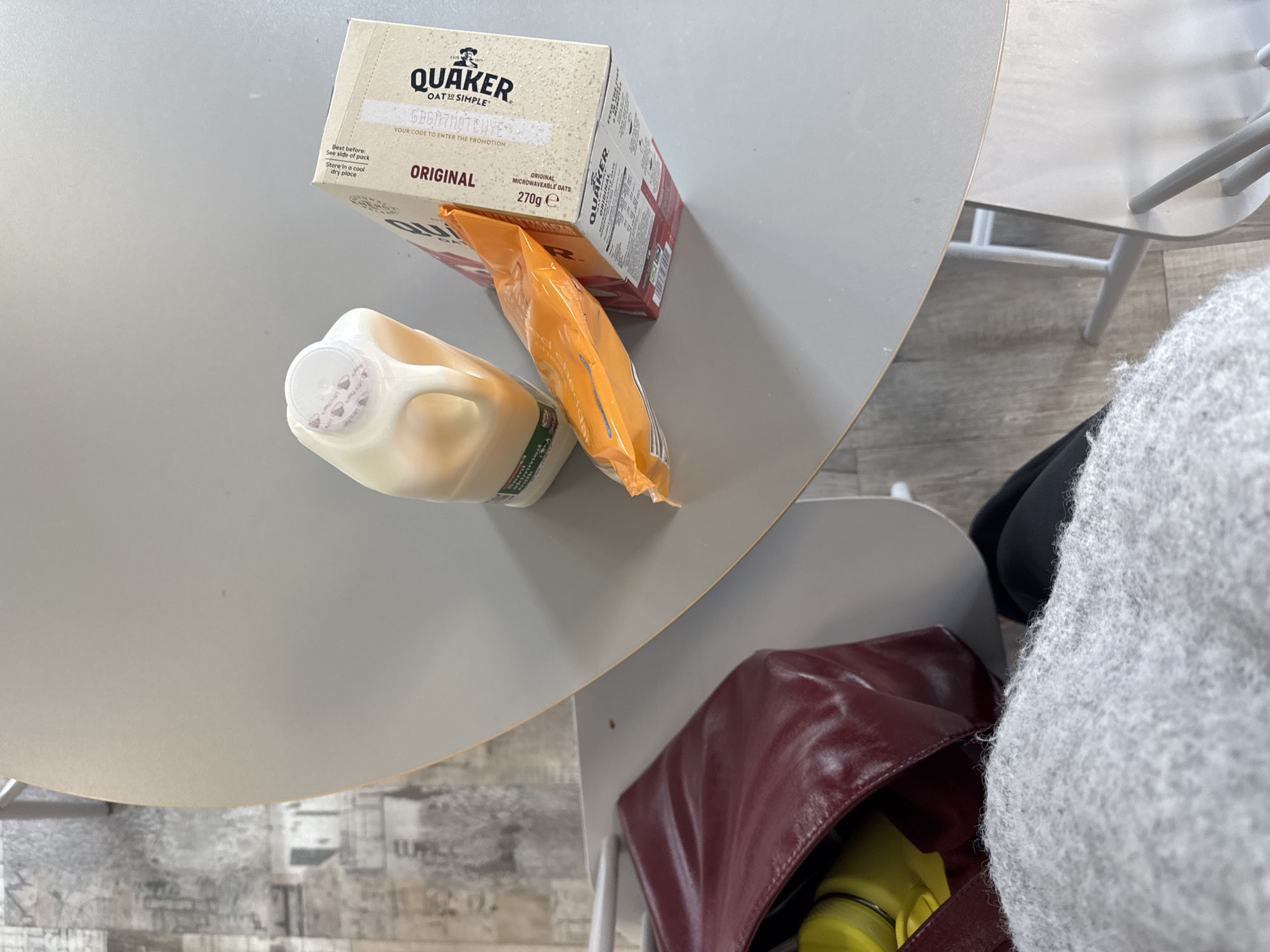 An overhead, slightly angled view depicts an indoor scene with a person partially visible in the foreground. A light grey table occupies the central and upper right portion of the frame. On the table, from left to right, are: a clear plastic jug containing a translucent yellow-orange liquid and capped with a white and pink closure; an orange plastic packet, appearing partially crumpled, with the word "Cheddar" faintly visible on its surface; and a rectangular cardboard box of "QUAKER OATS SIMPLE ORIGINAL" microwaveable oats, 270g, featuring red and white branding. In the bottom left, a person is seated, their lower torso covered by a light grey, fluffy garment, with black trousers or leggings visible underneath. A burgundy/maroon leather handbag, containing a yellow object, rests on a light-colored chair adjacent to the person. The flooring is a light-toned, wood-effect laminate or vinyl. Light-colored metal chair legs are visible beneath and around the table. The specific location within the city of Hull, United Kingdom, cannot be determined from the visual content.