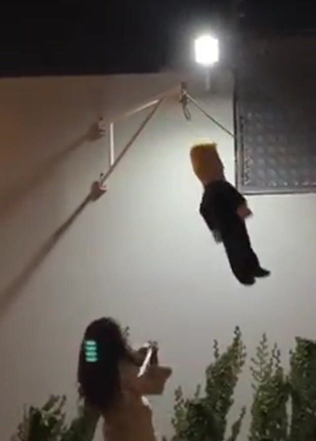 A young girl with long, dark, curly hair is hitting a Donald Trump piñata with a stick outside at night
