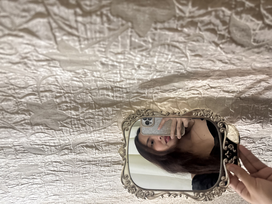 The image depicts an indoor scene in Davao City, Philippines. A female subject is seen in a mirror selfie, reflected from the chest up in a handheld, ornate mirror. The mirror features a cream-colored frame with intricate dark scrollwork and floral motifs. The subject has long dark hair, red lipstick, and wears a dark top. Her left hand is visible at the bottom, supporting the mirror. In the reflection, she holds a smartphone (an iPhone with a glittery case and multi-camera system), positioned to capture the image. The background is a wall covered with textured, light-toned wallpaper featuring an embossed floral or vine pattern.