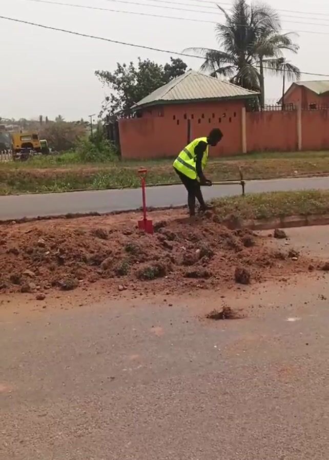 A man wearing a neon yellow safety vest is using a pickaxe to break apart a mound of dirt on a paved road