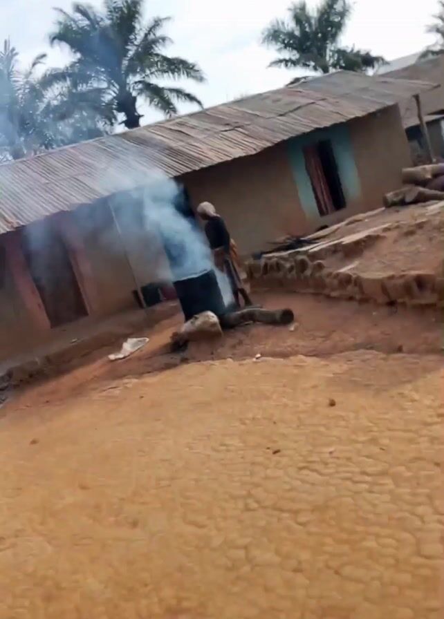 The video depicts a rural setting with a small building and a person tending a fire in a black barrel. Smoke is billowing from the barrel. The ground is cracked and dry. There are palm trees in the background.