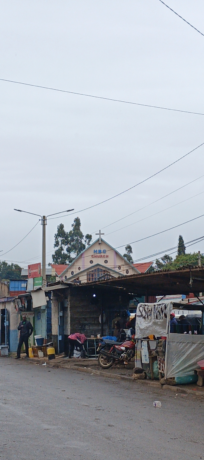 A street scene features a small church in the background with "HBG CHURCH" displayed above a cross on its roof. Below, the foreground is filled with informal roadside businesses under corrugated iron roofs. People are present, some standing near the storefronts and another bending over at their work. A red motorcycle is parked among the structures. Power lines crisscross the cloudy sky above. The wet pavement suggests it has been raining recently.