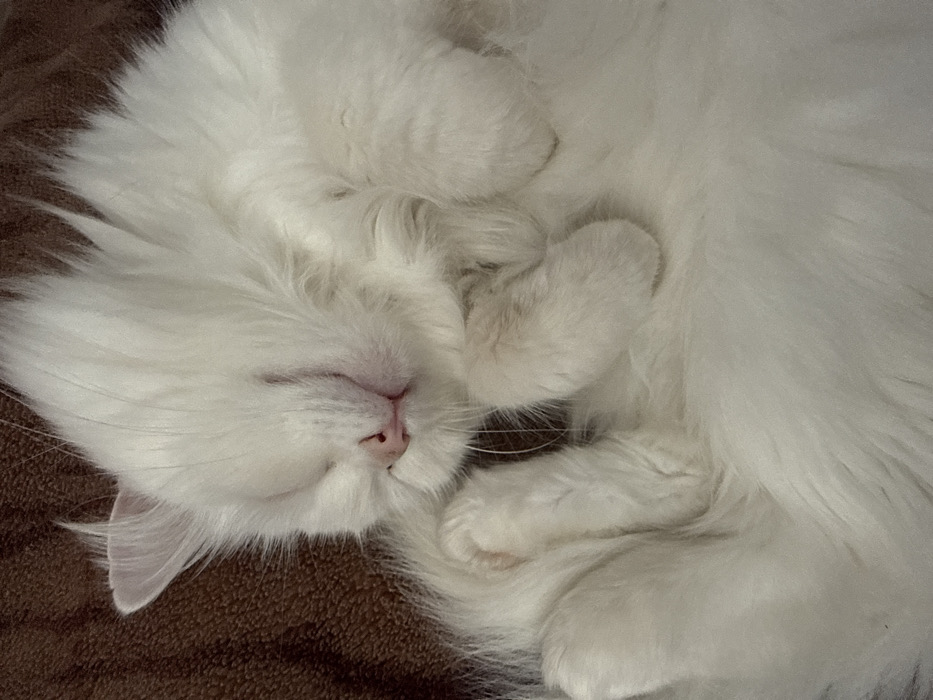 - "A white, long-haired domestic cat is depicted sleeping on a brown, textured textile surface within the city of Chaikovsky, Russia" by FM-PNepy2, licensed under CC BY 4.0