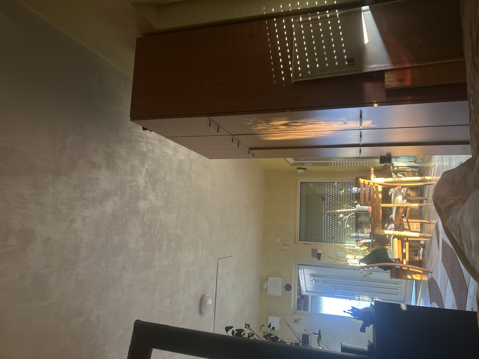The image depicts the interior of a domestic residence located in Verinsko, Bulgaria, observed from a low perspective. The scene is brightly illuminated by direct natural sunlight entering from the left and background. In the right foreground and midground, a tall, multi-paneled wooden wardrobe or cabinet extends from the bottom of the frame to near the ceiling. It features multiple doors with metallic handles. Direct sunlight casts distinct, horizontal striped patterns onto its surface, indicative of light passing through Venetian blinds or shutters from an unseen window to the right. A prominent vertical band of sunlight also illuminates the central panels of the wardrobe. In the center midground, a wooden dining table is visible with at least two matching wooden chairs positioned around it. Several objects, including two clear plastic bottles, are present on the tabletop alongside decorative branches or small potted plants. The background features light yellow-painted walls. To the left, an open, light-colored paneled door reveals an intensely bright outdoor or adjacent space. To the right of the open door, a window fitted with external roller shutters or internal blinds is visible, allowing diffused light into the room. A wall-mounted white rectangular object is affixed above this area. The ceiling is light-colored with a textured, possibly stucco or brushed finish, and a single circular flush-mount light fixture is present. A thin, dark linear mark or crack extends across a portion of the ceiling. The floor in the mid-to-foreground is covered by a patterned rug featuring abstract brown and cream shapes. No individuals are present in the frame.