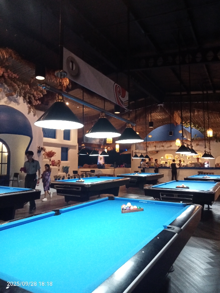 This image depicts the interior of a commercial establishment, likely a billiard hall or bar, located in Waso ward, Kenya. The scene, captured on 2025/09/28 at 18:18, features a dimly lit space with a high ceiling, adorned with numerous large, dark-colored conical pendant lights illuminating multiple blue-felted billiard tables. At least six black-framed billiard tables are visible, with the table in the foreground displaying a wooden rack containing a full set of pool balls. The decor includes white walls with blue-painted domed architectural elements and false window frames, reminiscent of Mediterranean styling. Portions of the ceiling or upper wall sections incorporate thatched material. A long banner with a stylized "1" and a red and white swirl design hangs horizontally from the ceiling. In the mid-ground, a male individual wearing a light shirt and dark trousers, possibly an employee, walks to the right while holding a red object. He is accompanied by a young female in a patterned dress. In the background, several individuals are present near a bar area with a white counter and visible bottles, suggesting service activity. Another individual is seen leaning on a billiard table further in the background. No active billiard game is currently in progress.