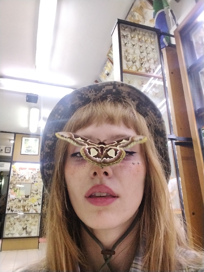 A woman with freckled skin and a camouflage hat has a large moth perched on her nose. She has light blonde hair with blunt bangs and dark eyeliner. Two small silver studs are visible on her right cheek. Her lips are slightly parted and tinted pink. Behind her are displays of pinned butterflies and moths, suggesting she is in a museum or collection. Fluorescent lighting illuminates the scene from above.