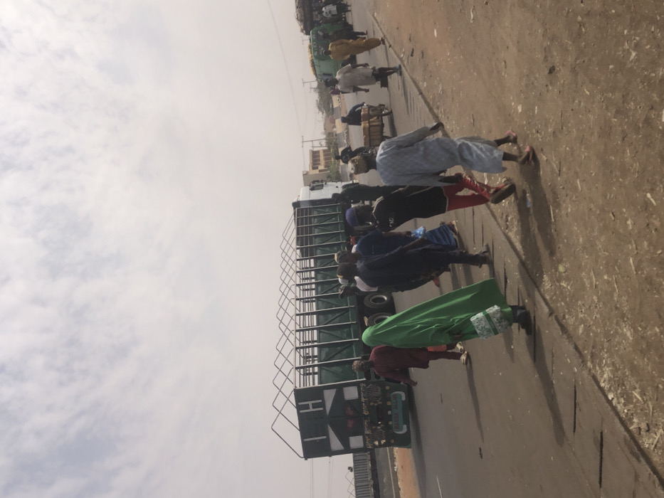 The image depicts a roadside scene in Kufena, Nigeria, under a hazy, overcast sky