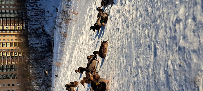 The image depicts a winter scene in Novoe Devyatkino, Russia, characterized by snow, bare trees, and residential buildings under clear sunlight. In the foreground, approximately 20-30 mallard ducks are dispersed across a snow-covered slope. A cluster of ducks, including drakes with iridescent green heads, stands on the left. Further right, another group of ducks is visible, with some resting directly on the snow. One duck is captured mid-flight, silhouetted against a snowy embankment in the mid-left. The middle ground features a dense stand of bare deciduous trees and shrubs, indicating a gully or riverbed, all covered in snow. In the far background, multiple large, multi-story residential buildings with numerous windows and balconies are prominently visible, illuminated by the sun. The snow in the foreground exhibits sparkling textures and subtle shadows, suggesting a sunny day with low-angle light. No human subjects are present.