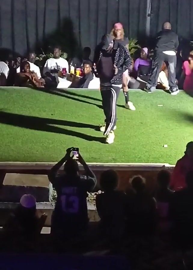 The scene captures a nighttime performance on a stage covered with artificial turf. Onstage, a male performer in a black outfit and white sneakers dances while holding a microphone. He is accompanied by a female dancer with pink hair, wearing a black top and white skirt. A crowd sits behind the stage, watching the performance. In the foreground, audience members are silhouetted as they watch and record the performance on their phones. The backdrop consists of a dark curtain and a fence.