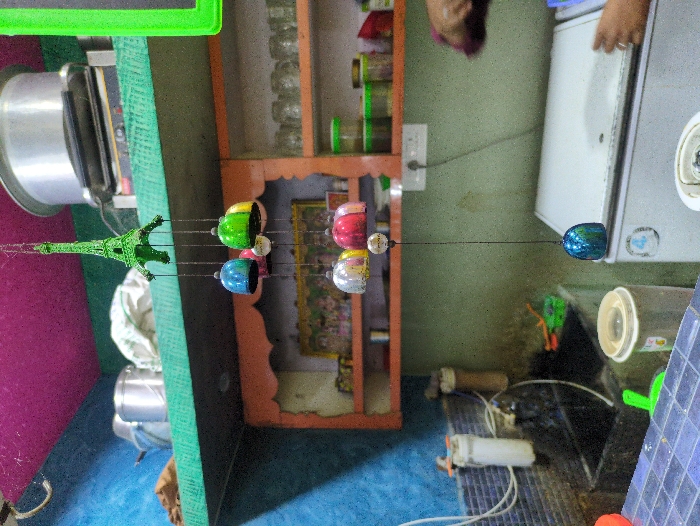 This image depicts an interior view of a functional kitchen or food preparation area located in Tiruvannamalai, India. A prominent wind chime, featuring a green Eiffel Tower replica at its apex, hangs from the ceiling in the upper-center, with multiple strings descending. These strings terminate in bell-shaped ornaments of various colors, including blue, green, silver, and red. The lowest visible bell is a dark blue. The upper portion of the scene reveals a green wooden shelf. On this shelf, several silver metal pots and a white cloth are stored. Above this shelf, a larger silver cooking pot rests on a metallic base, possibly a stove or hot plate. The ceiling or upper wall segments are painted in contrasting vibrant pink and blue. A bright green rectangular object is partially visible on the far right. In the mid-ground, a wooden cabinet with multiple compartments is visible. The central compartment frames a small religious image or idol. Various glass jars and containers are stored within the cabinet. Below this cabinet, against a light green wall, a white electrical outlet is present. To the left, a sink area features a dark basin, a faucet, and two white cylindrical water filters mounted on the blue-tiled wall. A green plastic scoop is situated near the sink. The lower portion of the image shows a blue tiled counter surface. A white lidded bucket or container sits on the counter to the left. On the right, a white chest freezer or refrigerator is visible, with a "4" logo on its side. Two human hands, one resting on the freezer lid and another appearing to interact with an unseen object, are visible on the right. A partial view of a head or hair is also present above the hands. The floor is not visible.