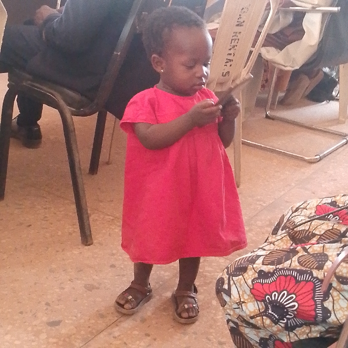 A young child, approximately two to three years old, with dark skin and dark hair, stands upright in an indoor setting. The child wears a bright red short-sleeved dress and brown open-toed sandals. A small earring is visible in the child's left ear. Both hands are holding a dark, rectangular object, possibly a mobile phone or remote control, which the child appears to be observing intently. The floor is tiled with light-colored, possibly beige, square tiles. In the background, to the left, a person's lower torso and legs are visible, seated in a black metal-framed chair, wearing dark trousers and shoes. To the right background, a chrome-framed chair with a white fabric covering is visible, bearing the partial inscription "G.N KENTA.S" on its backrest. A piece of patterned fabric, featuring red floral and brown leaf motifs, rests in the lower right foreground. The scene takes place indoors in the city of Gumel, Nigeria.
