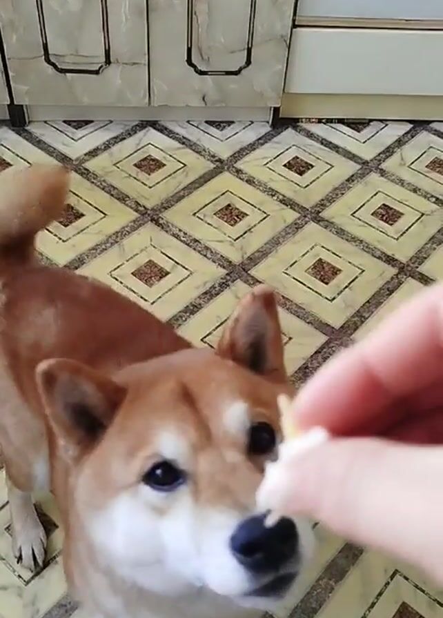 A hand holding a small, white treat is held in front of a Shiba Inu dog. The dog is indoors, standing on a tiled floor with a diamond pattern. The dog looks up at the treat and then takes it gently from the hand. Kitchen cabinets and an oven are visible in the background. The dog has a reddish-brown coat with white markings on its face and chest.