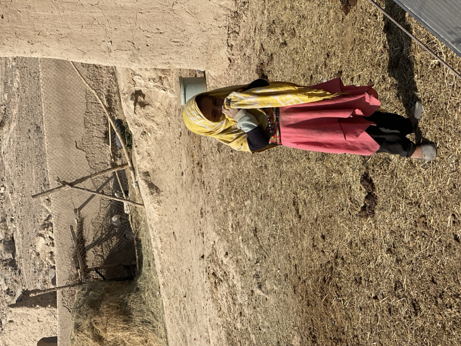 A young girl stands in an arid outdoor environment in Bazar-e Panjva'i, Afghanistan. She is positioned slightly right of the frame's center, facing forward. The girl wears a yellow head covering pulled over her head and held to her lower face with her left hand, a black long-sleeved top, a vibrant, embroidered vest or top, a pink layered skirt, and dark trousers beneath, paired with light-colored slip-on shoes. The ground is composed of dry, light-brown earth interspersed with straw and features visible animal droppings to the left of the girl. In the midground, to the left, is a large pile of hay. Behind the hay and extending across the frame is a low mud-brick wall. Beyond this wall, a rudimentary fenced enclosure constructed from wooden poles and wire mesh contains two light-colored animals, possibly goats or sheep. To the right of the girl, a tall, weathered mud-brick structure casts a shadow, with a light green bucket visible near its base. The background consists of barren, rocky hills and additional mud-brick structures under a clear sky.