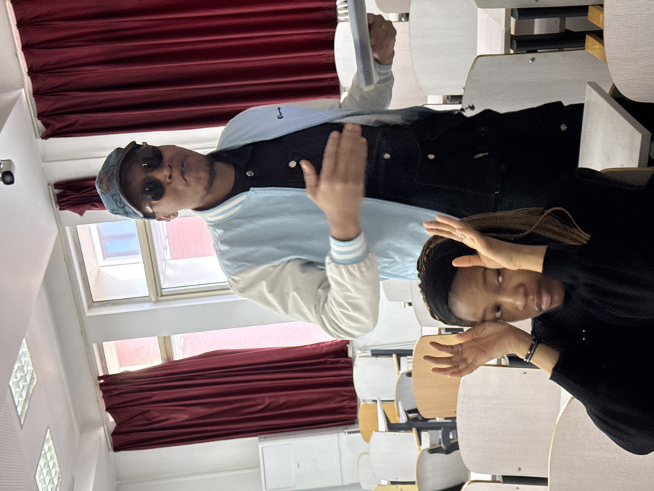 The scene is an indoor classroom or lecture hall, located in Daxing District, China. Two individuals are present. In the mid-ground, a dark-skinned male stands in an aisle between rows of desks. He wears a light blue and white varsity-style jacket over a dark collared shirt, dark sunglasses, and a patterned cap. His mouth is slightly ajar, and his left hand is raised, palm open, in a gestural pose. His right hand holds a light-colored, rectangular object. In the immediate foreground, a dark-skinned female is seated at a desk. She wears a black long-sleeved top and a black headband, with braided hair. Both of her hands are raised beside her head, palms inward, in a distinct gesture. Her eyes are partially open, and her gaze is directed upwards and to the left. She has a bracelet on her left wrist and a ring on her right ring finger. The room features rows of unoccupied classroom desks with light-colored tops and chairs with white backrests and light wooden seats. The walls and ceiling are white. Two fluorescent light fixtures are visible on the ceiling. In the background, two tall windows with drawn red curtains reveal a glimpse of a light-colored exterior building. A white rectangular unit, possibly an air conditioner or vent, is mounted on the wall to the left of the windows.