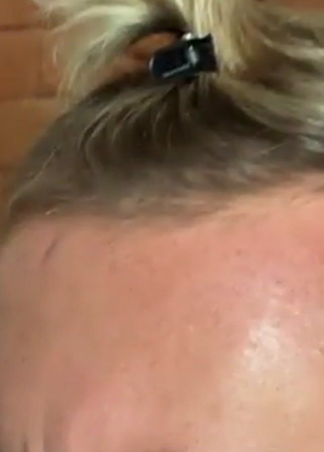 close-up of a man's head and hair. He is wearing a white shirt. His hair is short on the sides and longer on top. The longer hair is pulled up and held in place with a small black plastic clip. The background is a brick wall. The camera zooms in on the clip.