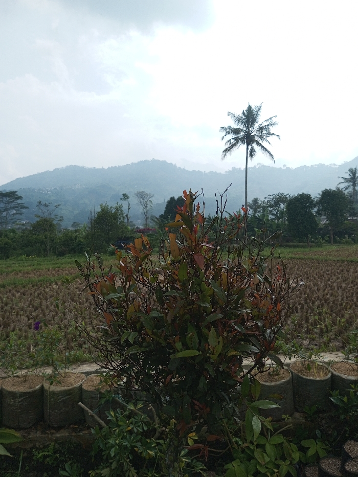 A verdant scene unfolds with a foreground of potted plants and a reddish-green bush, contrasting with the dry, harvested field behind. In the middle ground, trees punctuate the landscape, leading to misty, verdant hills under a cloudy sky. A tall palm tree stands prominently, adding to the tropical ambiance. The atmosphere is tranquil, emphasizing the natural beauty of the rural setting.