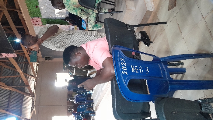 This image captures an indoor event within the city of Akwanga, Nigeria. The scene features multiple individuals in a building with a corrugated metal roof supported by exposed wooden rafters and light-colored plastered walls. The floor is tiled with light-colored square tiles. In the mid-ground, a male subject in a light pink polo shirt and dark trousers is seated in a black chair, intently focused on a dark-colored smartphone held horizontally in both hands. His left forearm rests on the chair's armrest. Behind him, a second male subject, wearing a light-colored patterned short-sleeved shirt and dark trousers with shiny black shoes, stands holding a green smartphone horizontally with both hands, aiming it forward as if recording or taking a photograph. He wears a thin bracelet on his right wrist. To the right of the standing individual, a third male subject is partially visible, seated, wearing a green camouflage-patterned long-sleeved shirt and dark trousers. In the background, a raised platform or stage area is visible, with a white fabric backdrop decorated with pink floral arrangements on the upper right side. A banner with the partial text "LIMITED W" is discernible on the backdrop. Further back, additional individuals are seated on blue plastic chairs, facing forward. One such blue plastic chair is prominent in the foreground, displaying the text "2022" in white on its backrest. A single bare light bulb hangs from the ceiling. Natural light appears to enter from a window or opening on the left side of the room. A small plastic water bottle is visible on the raised platform in the left background.