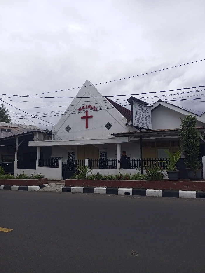 An exterior photograph presents the Immanuel church in Meyong, India, under an overcast sky. The primary structure features a white facade with a prominent triangular gable displaying the name "IMMANUEL" in red capital letters above a large red Latin cross. Two square windows with diamond-shaped patterns flank the cross. A covered porch extends across the building's front, behind a black decorative metal fence. To the right of the main gable, a white rectangular sign with green elements and unreadable text is mounted. One male individual, dressed in dark clothing, stands behind the fence to the right of the church's central area. In the foreground, an asphalt road runs horizontally, bordered by a black and white checkered curb. A raised planter, containing various green shrubs and potted plants, is positioned between the curb and the church property. Overhead, multiple black power lines traverse the upper portion of the frame.