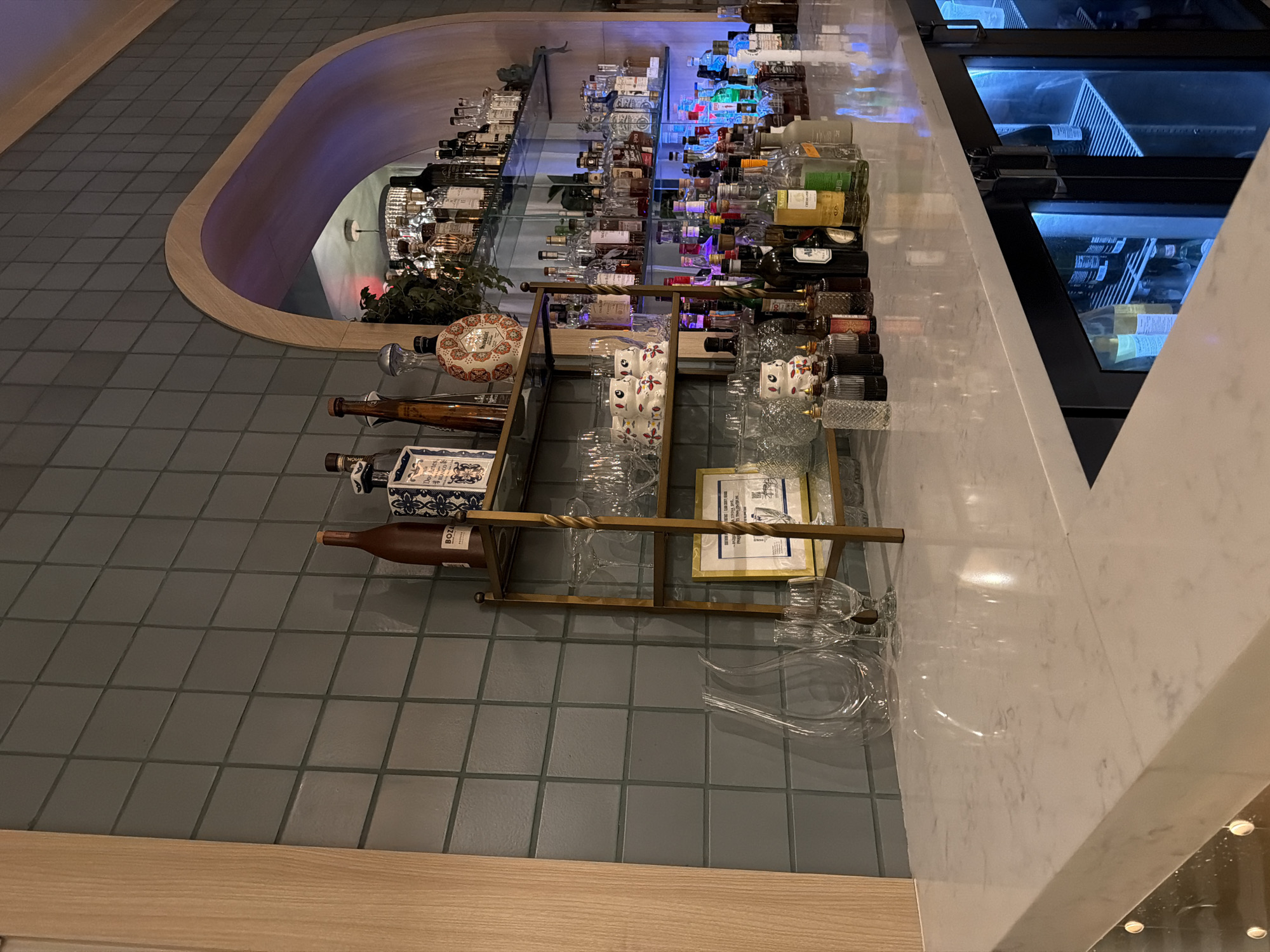 This image depicts an interior view of a bar in Las Vegas, United States, presented from the perspective of a patron standing at the counter. The foreground features a light-colored, reflective stone or marble countertop. In the midground, to the left, a tall, three-tiered golden metal shelf unit holds various clear glass items, including wine glasses, tumblers, and two white ceramic owl-shaped mugs with red floral patterns. Also on this unit are a dark brown bottle labeled "BOZA" and a blue and white patterned bottle identified as "Dos Artes Blanco," along with a framed document or artwork on the bottom shelf. To the left of this unit, on the counter, are a large clear glass decanter and two smaller clear glasses. The background reveals a wall clad in square, dark teal-grey tiles. On the right side of the image, an arched opening, framed in light-colored wood, leads to another section of the bar. Through this archway, multiple glass shelves are visible, densely packed with various bottles of alcohol. This area is illuminated by blue and purple ambient lighting, and reflections of a circular chandelier-style light fixture and green foliage are discernible. Along the main back wall and extending into the arched area, numerous bottles of spirits are arranged on multiple glass shelves. Below the main counter on the right, two glass-fronted refrigeration units with internal blue lighting are visible, containing additional bottles. No people are present, and no active interactions are occurring. The scene is static, well-lit, and showcases a well-stocked and modern bar environment.