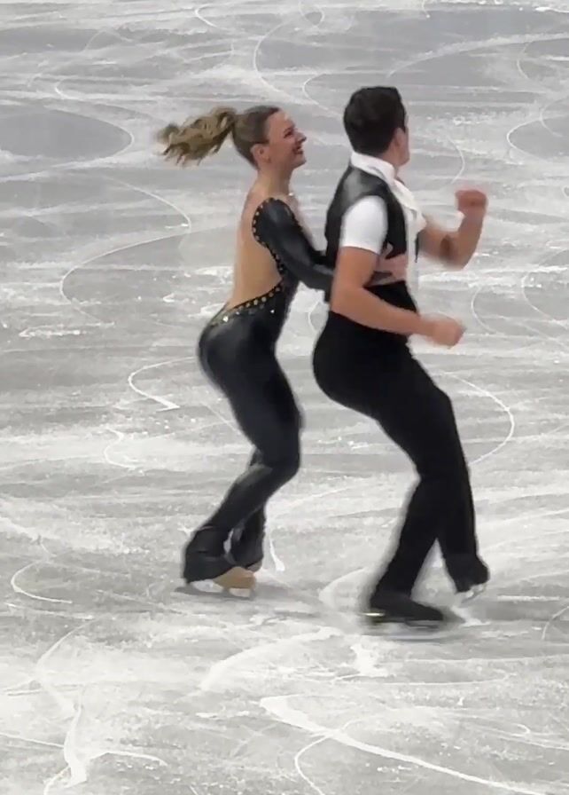 two ice skaters, a man and a woman, performing on an ice rink. The man is wearing a white shirt with a black vest and black pants. The woman is wearing a black bodysuit with a low back, embellished with gold details. They are dancing together, moving across the ice in a coordinated manner. The ice is marked with skate lines and the rink is bordered by blue barriers.