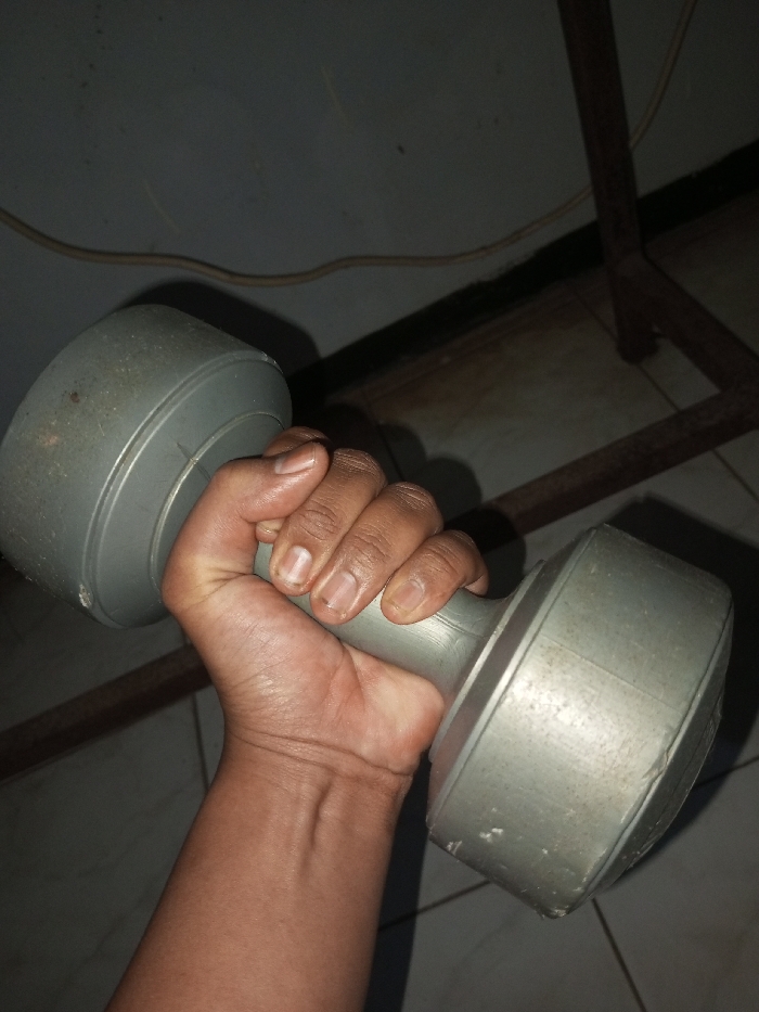 A hand grips a grey, dumbbell. The skin tone of the hand is dark. The nails are light in color. The dumbbell has a cylindrical shape with larger, rounded ends. A power cord stretches along the wall behind the dumbbell. A portion of a metal chair can also be seen behind the dumbbell. The flooring is tiled. The lighting is dim.