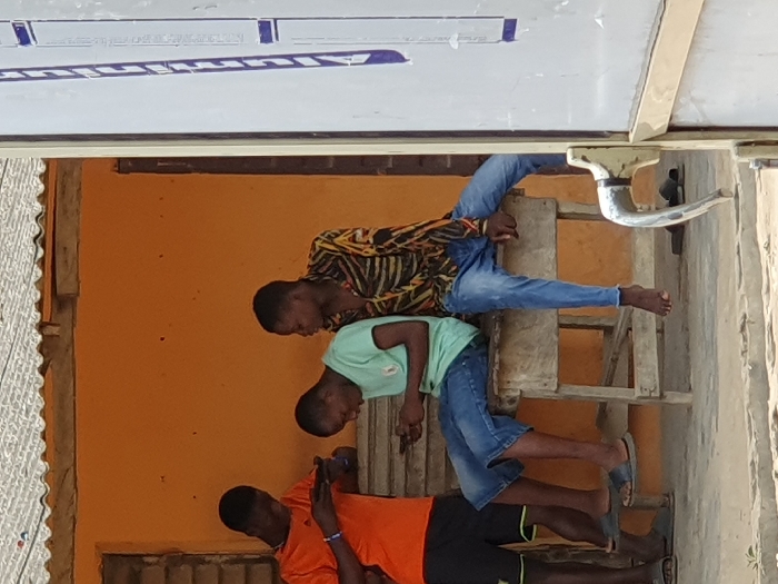 - "The scene depicts three young males in an outdoor setting under a corrugated metal roof overhang, against an orange-painted concrete wall, characteristic of a casual public or semi-public space in Lagos, Nigeria" by FM-axXTn1, licensed under CC BY 4.0