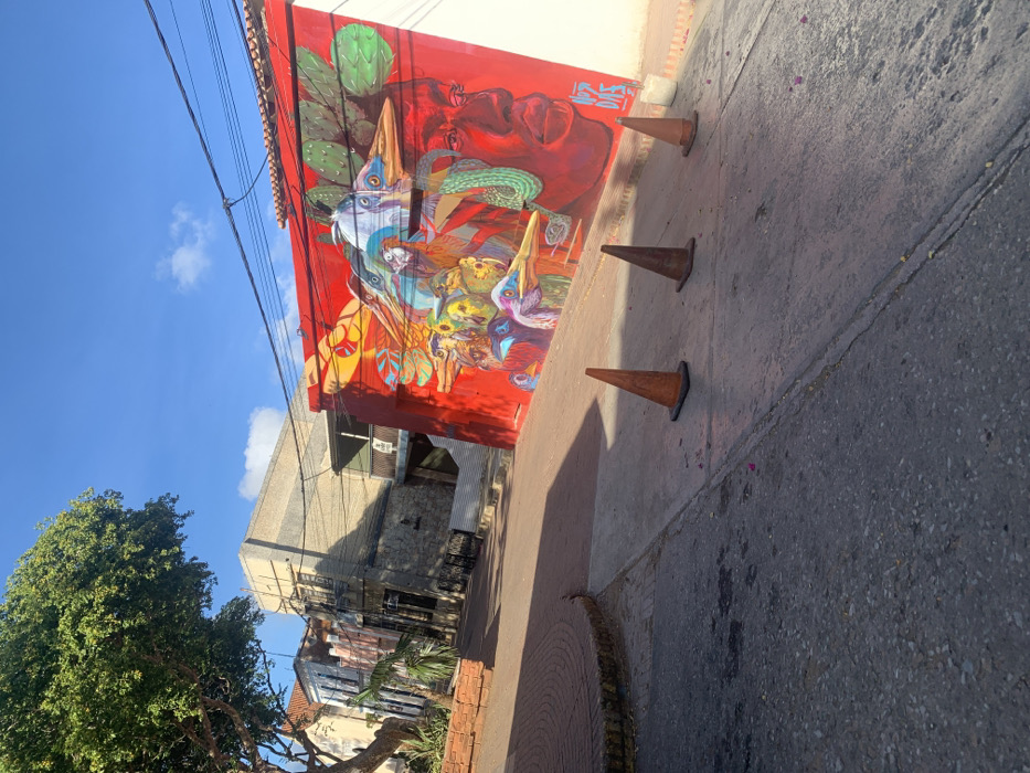 A street scene features a vibrant mural on a red building, depicting a collection of birds and foliage