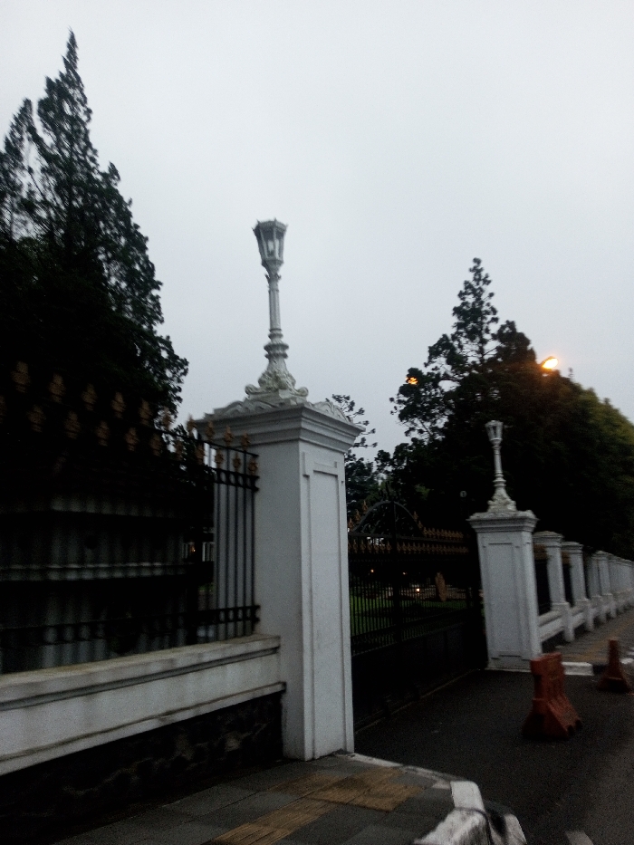 The image depicts an exterior view of an ornate gate and fence structure under an overcast sky in Chagzam_Pam, Bhutan. No individuals are present. In the foreground, a dark asphalt road or pathway is visible, bordered on the left by a light gray sidewalk featuring a yellow tactile paving strip. Two orange plastic traffic barriers stand on the asphalt to the right. A prominent white perimeter wall, topped with black wrought iron fencing that includes gold-colored decorative elements, extends from the left. This wall incorporates several large, white, neoclassical-style pillars. The main entrance features a substantial white pillar on the left, topped with a tall, decorative gray streetlamp. To its right, another smaller, similarly designed white pillar also supports a gray streetlamp. The black wrought iron main gate appears to be open, providing a glimpse into a dark, tree-lined interior space. A continuous series of smaller white pillars extends along the perimeter wall to the right. Tall, dark coniferous trees dominate the left side of the frame and are visible behind the gate and pillars on the right, where a faint orange light source is discernible amidst the foliage. The sky is a uniform, light gray.