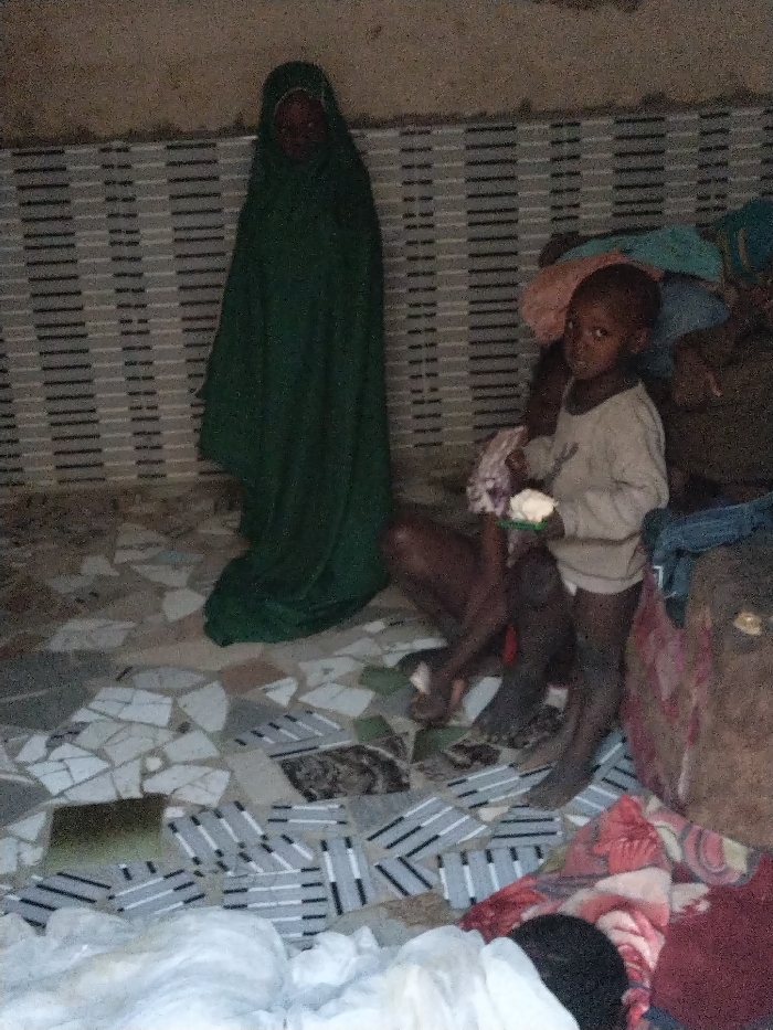 A person in a long green robe stands next to a tiled wall. A young child with a pale shirt is standing on a patterned floor, holding food or an object. An adult sits behind the child. The room appears sparsely furnished, with blankets and other items scattered on the floor. The lighting is dim.