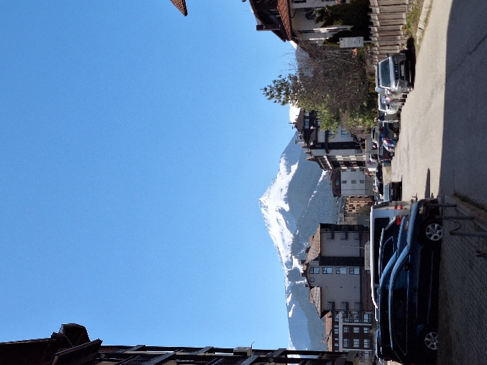 The image displays a street view in Bansko, Bulgaria, under a clear, bright blue sky. The perspective looks down a paved street that gently curves to the right, leading towards a snow-capped mountain in the distance. In the immediate foreground on the left, the upper section of a multi-story building, featuring dark balconies and a dark roof gutter, is partially visible. Adjacent to this, on a paved surface, a dark-colored station wagon is parked, followed by a white van and other parked vehicles further along the curb. The midground is occupied by the street, which is lined on both sides by numerous parked cars. Several multi-story buildings, consistent with residential or hotel architecture, feature pitched roofs with reddish-brown tiles. Sparse trees, including a bare deciduous tree and a taller coniferous tree, are visible among the buildings. A light brown wooden fence runs along the right side of the street. The background is dominated by a large, prominent snow-capped mountain peak, characteristic of the Pirin Mountains, under a cloudless blue sky. Dark green coniferous trees are visible on the lower slopes of the mountain beneath the snow line. No individuals are discernible within the frame.