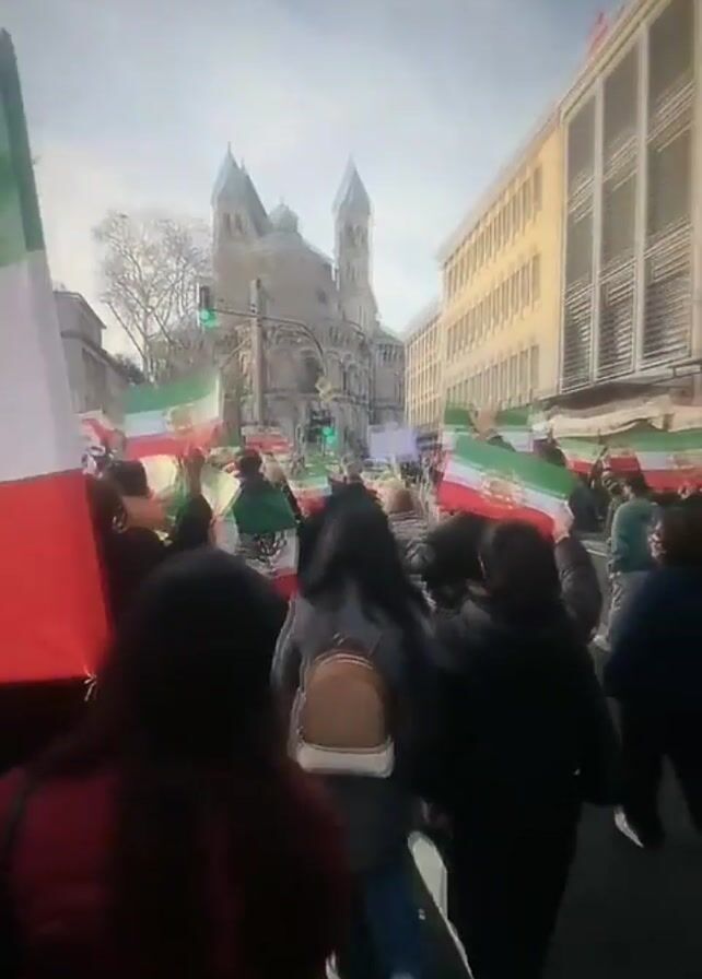 The video depicts a crowd of people walking along a city street, holding and waving flags bearing the colors green, white, and red