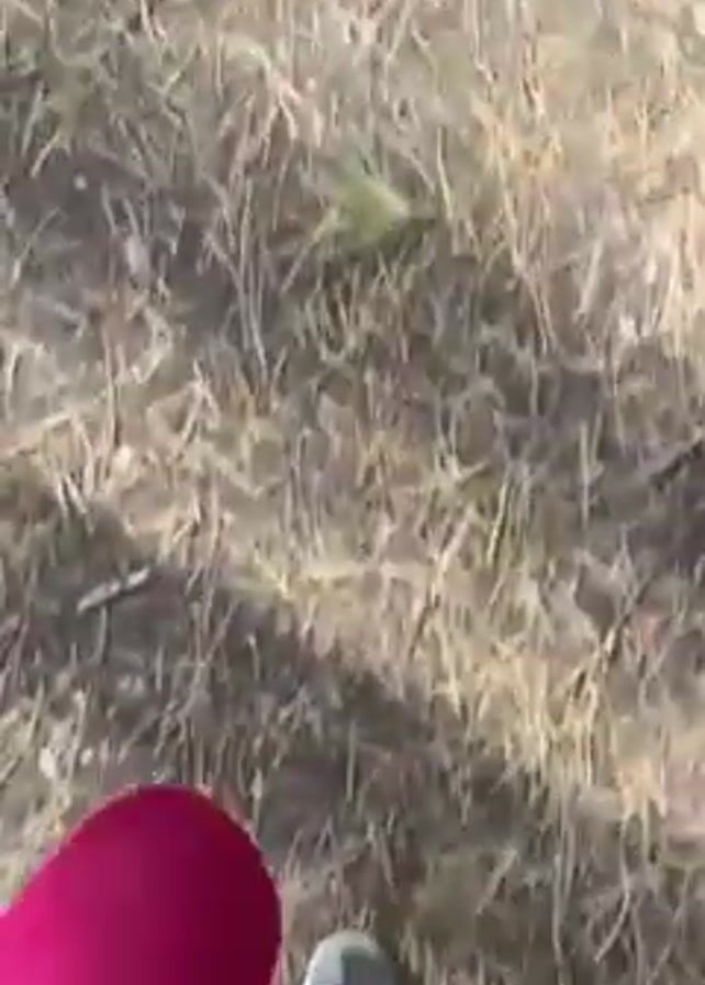 A person wearing magenta pants and dark sneakers with pink-striped socks walks on a path covered in leaves, twigs, and dirt through a forest of tall, bare trees with light filtering through the canopy. The camera angle is from the perspective of the person walking.