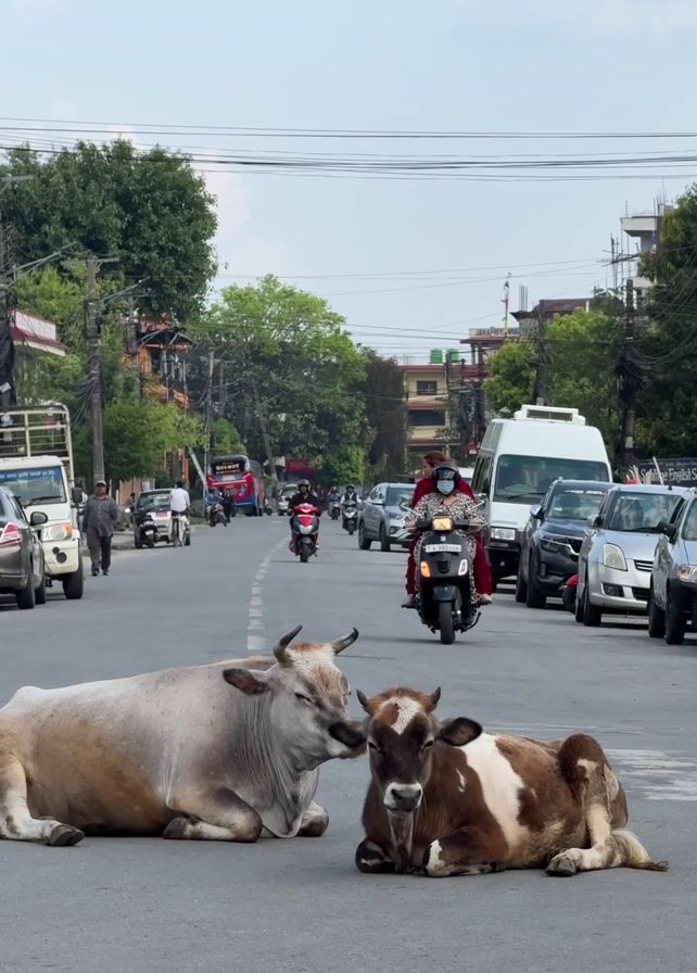 - "In a medium shot, two cows lie in the middle of a road, while traffic maneuvers around them" by FM-HLHiK2, licensed under CC BY 4.0