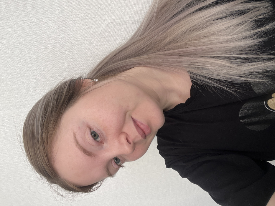 The image depicts an adult female positioned for a head and upper torso shot indoors, against a light-colored, textured wall, presumed to be in the city of Chaikovsky, Russia. The individual has a fair complexion with light freckles, light-colored eyes, and light brown/ash blonde hair pulled back into a ponytail behind her right ear. She wears a black short-sleeved t-shirt with a partial gold and black patterned design visible on the chest area. A small, silver-toned drop earring with a clear gemstone is visible in her right ear. She is looking directly at the camera with a slight, closed-mouth smile, her head tilted slightly to the left. No other individuals or distinguishing objects are present in the frame.
