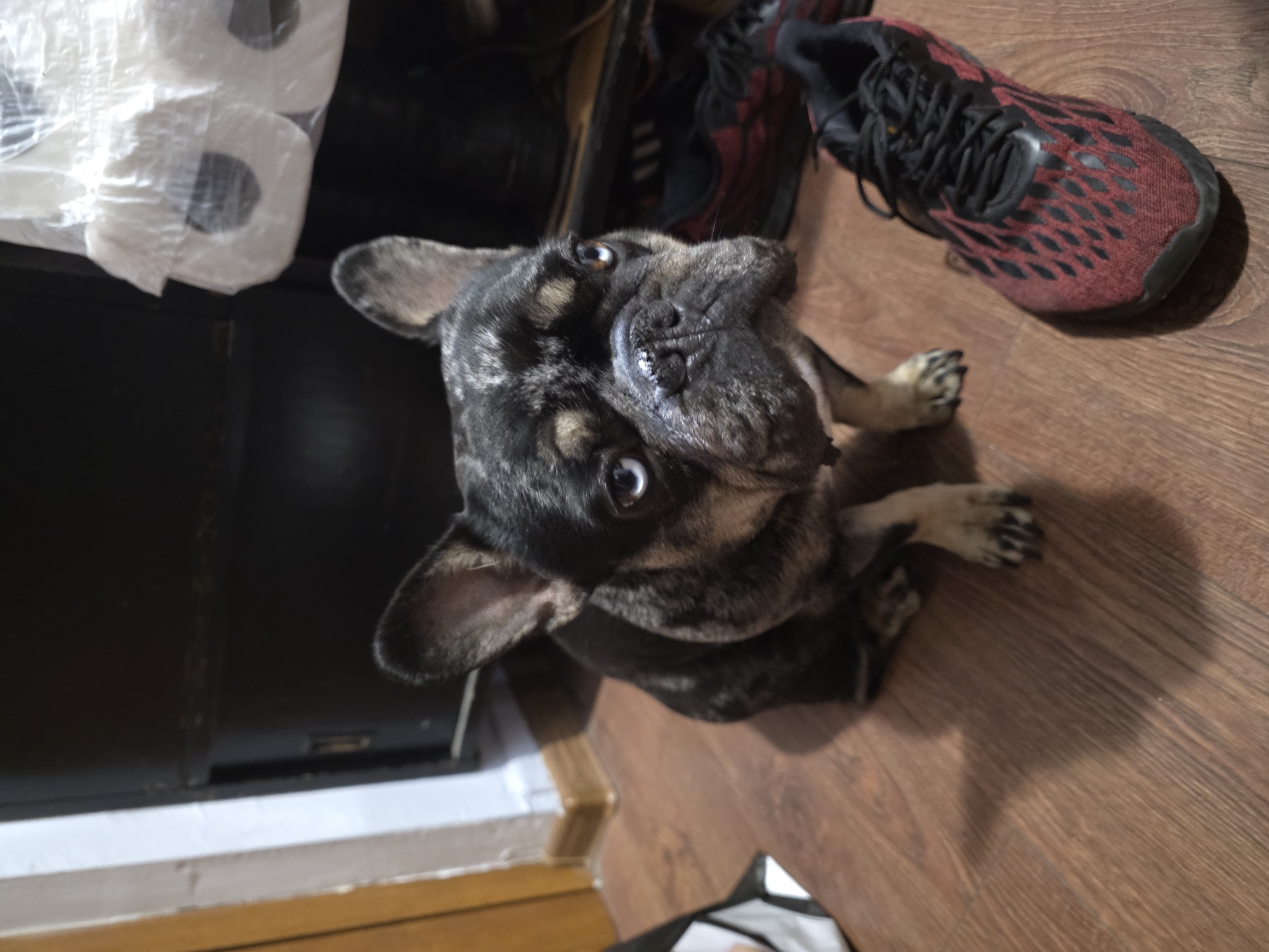 - "An indoor scene in Dupnitsa, Bulgaria, depicts a brindle French Bulldog with blue eyes, seated on a light brown wooden laminate floor" by FM-moJH62, licensed under CC BY 4.0