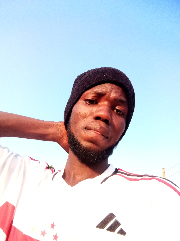 A young Black man in a black beanie gazes at the camera. He sports a neatly trimmed beard. His white jersey features red and black details, including the Adidas logo and stars. His left hand rests behind his neck. A clear blue sky forms the background. The angle is a low perspective, looking upwards at the subject. Sunlight highlights the scene.