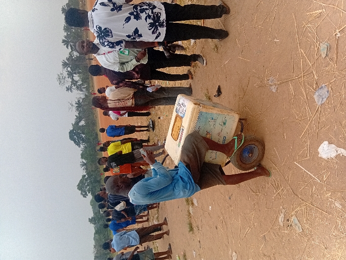 A man with a light blue shirt pulls a white cooler on wheels across a dirt field. A line of people stand behind him. Some are in t-shirts, others in collared shirts and casual pants. The ground is brown and dusty with bits of debris scattered around. Palm trees appear in the background. The sky is overcast, and the scene seems outdoors during the day.