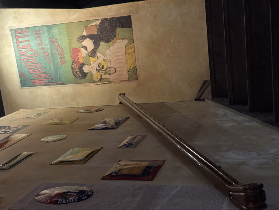 An indoor scene features a large advertising poster on a wall, depicting two women and the words "La Marquisette, Liqueur du Dessert." Below the poster is a flat surface covered with vintage-style tin signs. A long, polished wooden railing or bar spans the surface diagonally. The composition includes a glimpse of dark wooden panels or doors to the right, creating a sense of depth and contrast.