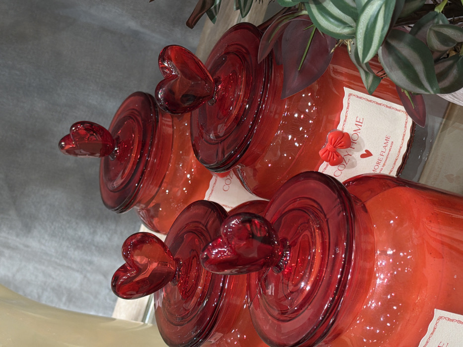 Four red glass jars with heart-shaped lids are stacked together. The jars have labels with "COZY HOME" printed on them. Green striped leaves are visible on the top right. The background is a neutral gray and white. The arrangement is lit softly, highlighting the glossy finish of the jars.
