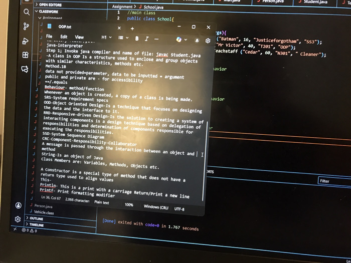 The image displays a computer monitor positioned at an angle, primarily showing a dark-themed integrated development environment, likely Visual Studio Code. Multiple tabs for Java files are visible at the top, including `School.java`, `Man.java`, `Person.java`, `Student.java`, and `Teacher.java`. Overlaid on this interface is a smaller, white text editor window titled "OOP.txt", which contains definitions and explanations of Object-Oriented Programming (OOP) concepts in English, such as "Java-Interpreter", "Class", "Behaviour- method/function", "OOD-Object Oriented Design", "RRD-Responsive-Driven Design", "CRC-Component-Responsibility-Collaborator", "String-Is an object of Java", "Constructor", "Println- This is a print with a carriage Return/Print a new line", and "Printf- Print formatting modifier". Behind the "OOP.txt" window, segments of Java code are visible, including lines that appear to instantiate objects or call methods with parameters like `("Batman", 16, "Justiceforgotham", "SS3")`, `"Mr Victor", 40, "T201", "OOP")`, and `eachstaff ("Cedar", 60, "N301", "Cleaner")`. The bottom status bar of the main editor displays "Ln 36, Col 67", "2,066 character", "Plain text", "100%", "Windows (CRLF)", "UTF-8", and the output "[Done] exited with code=0 in 1.767 seconds". No individuals are present in the image. The immediate environment is an indoor setting; however, there are no discernible visual cues within the image to specify the location as Calabar, Nigeria, or any other particular city.
