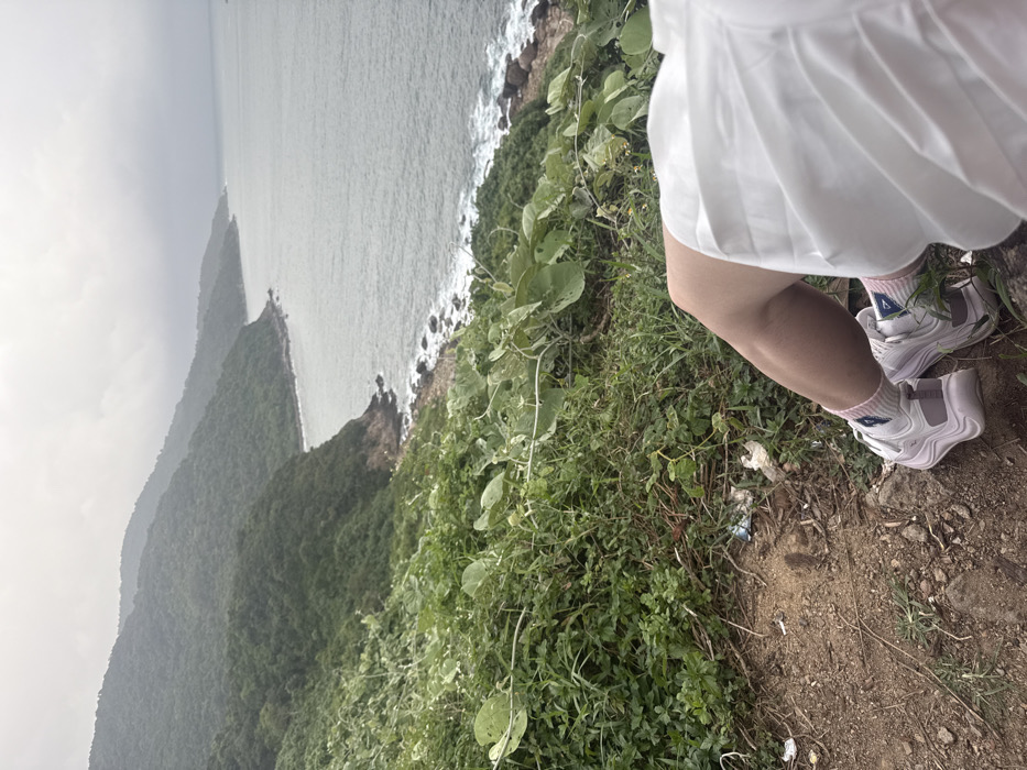 The image displays a coastal viewpoint in Sơn Trà Ward, Vietnam, under an overcast sky. In the foreground, the lower legs of an individual are visible, clad in a white pleated skirt or dress, light pink crew socks, and white and light purple athletic sneakers. The individual is positioned on a dirt-covered incline interspersed with dense green vegetation, with some scattered litter present on the ground. Beyond this, a series of lush, tree-covered hills slope steeply down to a rocky coastline. The sea, appearing grey and slightly choppy, extends into the distance, following the curve of the coastline. No other people or explicit actions/interactions are observed.