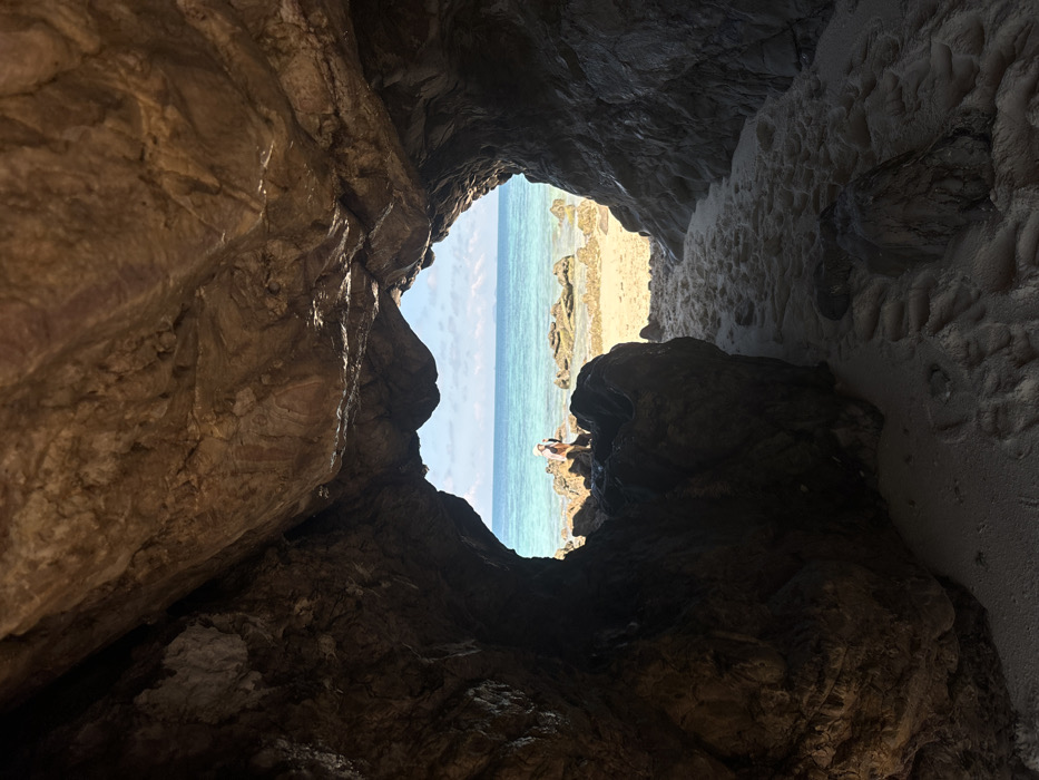 This image presents a view from within a natural rock cave, looking out onto a tropical beach scene on Ko Tarutao, Thailand