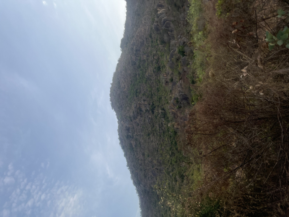 A mountain looms, covered in rocks and sparse greenery. To the right, parched, brown bushes create a stark contrast with the mountain's base. The sky above is pale blue, dotted with faint clouds. The perspective of the image is tilted slightly, giving an unconventional view of the natural landscape.
