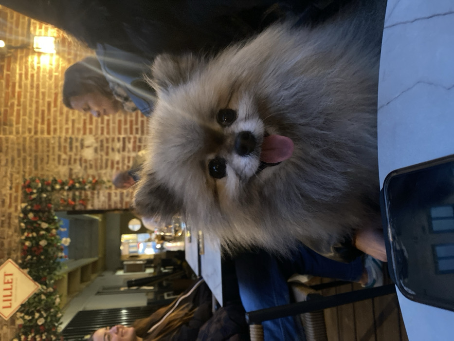 The image depicts a small, fluffy grey and tan Pomeranian dog occupying the central foreground, looking directly at the camera with its tongue slightly out and an open-mouthed expression. The dog appears to be seated on a lap or elevated surface at a white, marble-patterned table, where a black smartphone with a reflective screen rests in the immediate foreground. In the mid-ground, to the left, a woman with dark hair is visible from the chest up, smiling and looking left. Her legs, clad in blue jeans and light-colored sneakers, are visible beneath the table. Further back, on the right side of the frame, another woman with dark hair and a light-colored scarf is partially visible, facing towards the right. A man is dimly seen in the deep background. The setting is an indoor restaurant or café in Lille, France, characterized by a exposed brick wall in the background. Overhead, a white, diamond-shaped sign with "LILLET" in red lettering is affixed to the ceiling, above a decorative garland of red and white artificial flowers draped along an exposed wooden beam. Warm-toned wall-mounted light fixtures illuminate the brick wall. A table with a wine glass containing a pale liquid is visible between the two women in the background. The general ambiance is one of casual dining.
