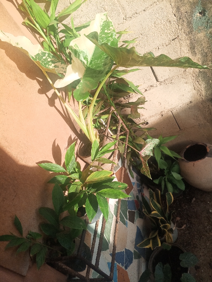 A cluster of potted plants sits on a tiled surface near a textured wall. Prominent among them is a large-leafed variegated plant with shades of green and white. Below it, a plant with smaller, elongated green leaves fills another pot. A snake plant with yellow edges is also visible. An open-mouthed earthenware pot rests on the ground nearby, completing the scene. The entire arrangement is bathed in warm sunlight, casting shadows on the wall.