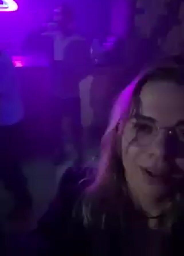 two women in a dimly lit, crowded club with a bright purple light illuminating a band performing on a stage. The first woman wears glasses and faces the camera while speaking. The second woman is behind her. The camera then pans through the crowd, showing other people dancing and moving around. A brightly lit, stylized "K" logo is visible above the stage. The lighting is purple and smoky.