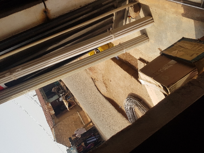 The image depicts an outdoor commercial street scene in the city of Jos, Nigeria, viewed from what appears to be a shop's interior looking outwards. In the immediate foreground, on the left, a stack of brown cardboard boxes rests on a concrete floor, beside a large coil of barbed wire on reddish-brown earth. To the right, multiple bundles of white pipes, possibly PVC, are stacked vertically against a dark vertical structure. A paved asphalt road with uneven dirt shoulders runs diagonally through the midground, from the lower left towards the upper right. On the left side of the road, a person wearing a light-colored long-sleeved shirt stands near a display rack exhibiting various merchandise items. Further down the street, in the background, a single-story building constructed of light-brown material, possibly earth or stucco, features a rusty, corrugated metal roof. In front of this building, two individuals are seated behind a wooden stall or table laden with items for sale. The sky above is clear and bright, indicating daytime.