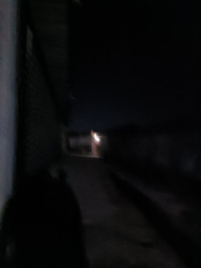 A dark and blurry nighttime scene shows a narrow alleyway. An indistinct figure is visible in the foreground, obscuring the left side. A dim, glowing light is present at the far end of the alley, between buildings. Shadowy shapes of structures line both sides of the path. The ground surface is dimly illuminated and mostly undefined.